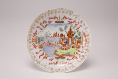 Witte schotel met op het plat een meerkleurige voorstelling van een "Hollands landschap" met vissende mensen, een boogbruggetje, torentjes, schepen en water. Langs de rand, deels weggesleten goudkleurige decoraties. (Nederlands)