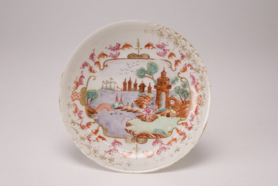 Witte schotel met op het plat een meerkleurige voorstelling van een "Hollands landschap" met vissende mensen, een boogbruggetje, torentjes, schepen en water. Langs de rand, deels weggesleten goudkleurige decoraties. (Nederlands)