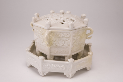 Witte (blanc de chine) acht-kantige koro met deksel op acht pootjes en met vier oortjes. Op het opengewerkte deksel een reliëfdecor en negen knopjes. Op de buitenzijde van de koro acht reliëfdecors. (Nederlands)