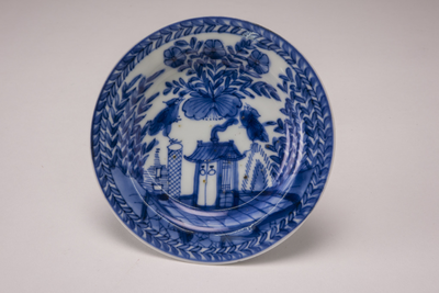 Wit schoteltje met donkerblauwe zogeheten; "Koekoek uit het huisje" decoratie met o.a. bladertakken, bloemen, twee vogels en een huisje. (Nederlands)
