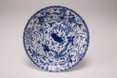 Wit gelobd schoteltje met gegolfde rand. Blauw gedecoreerd op het plat een krab en twee antiquiteiten omgeven door planten. De rand is gedecoreerd met vissen en planten.