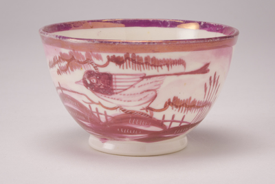 Cremekleurig kopje met op de buitenzijde een paars roze boom met een grote vogel. Hieroverheen een metaalachtige glanzende glazuurlaag. (Nederlands)