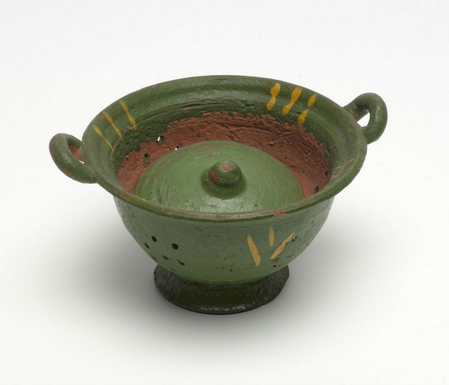 Schaalmodel van een aardewerken vergiet met bijbehorende deksel