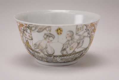 Theekop op voetring, spreidende wand. Versierd in encre de chine en goud met een inkijk in een interieur binnen een geschulpt medaillon. Achter een balustrade zitten een man en een vrouw, hij speelt gitaar, zij kijkt naar een opspringende hond voor de balustrade. Links in het vertrek een tafel met een kom en een hoge kop met oor, daarboven een opwaaiend gordijn, rechts een wandkandelaar en een open raam. Op de wand van de schotel wijnranken en Aziatische eekhoorns met een lange staart in goud; dit motief is ook op de kop tussen de twee medaillons in geschilderd. (Nederlands)