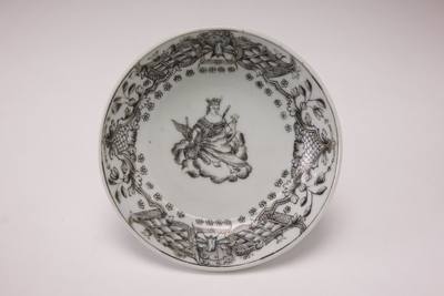 Een Chine de Commande porseleinen wit schoteltje met op het plat een in 'Encre de Chine' aangebrachte Europese voorstelling van de godin Juno (Hera), de godin van het huwelijk, Van Diepencollectie, JMD-P-1321 |