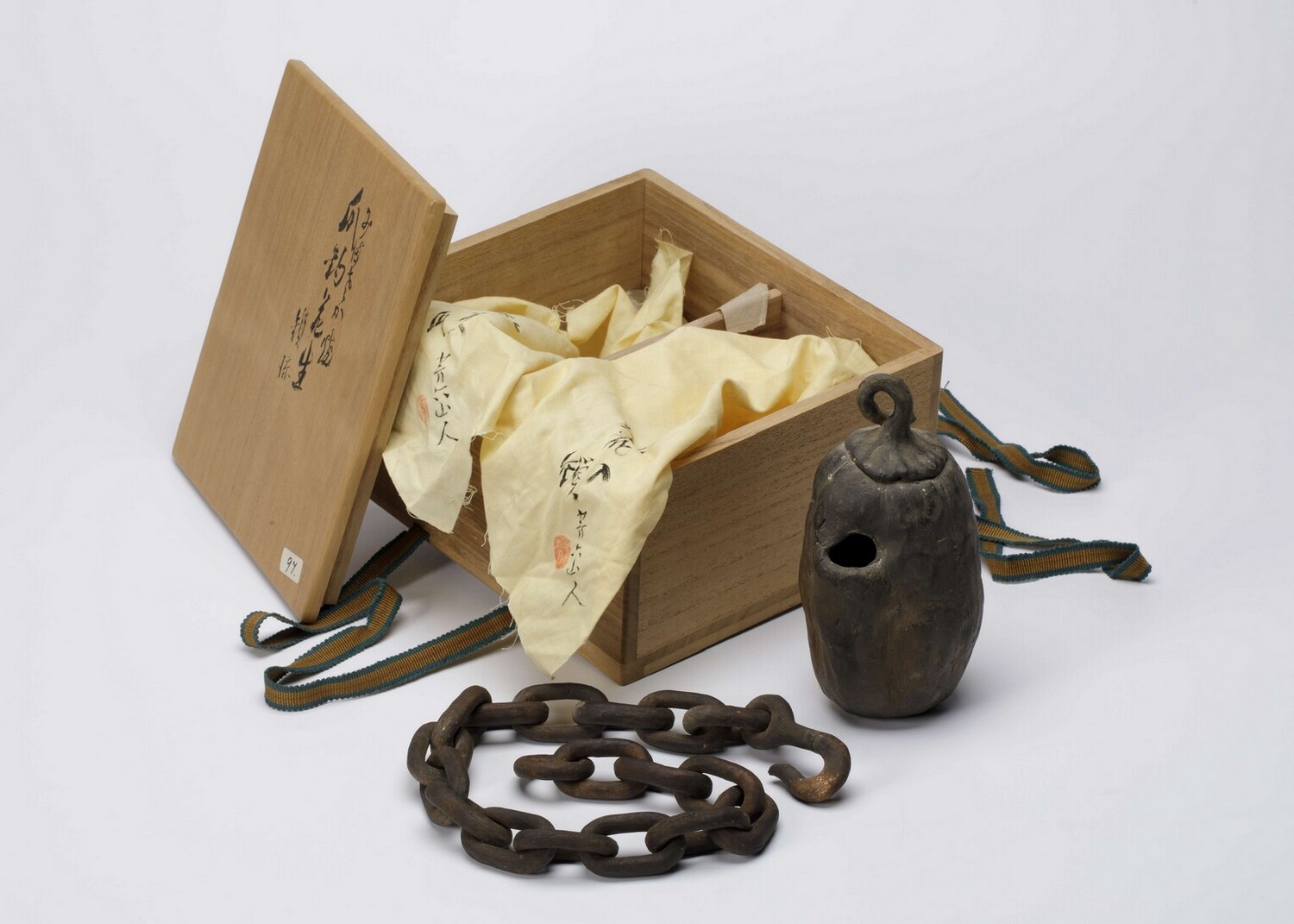 Vaas met ketting in doos met deksel en twee lappen textiel (Nederlands)