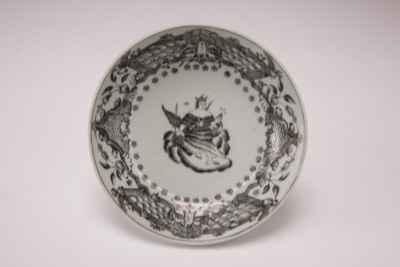 Een Chine de Commande porseleinen wit schoteltje met op het plat een in 'Encre de Chine' aangebrachte Europese voorstelling van de godin Juno (Hera), de godin van het huwelijk. (Nederlands)