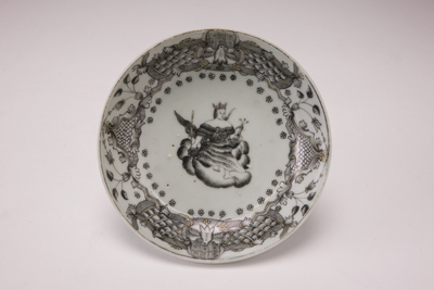 Een Chine de Commande porseleinen wit schoteltje met op het plat een in 'Encre de Chine' aangebrachte Europese voorstelling van de godin Juno (Hera), de godin van het huwelijk. (Nederlands)
