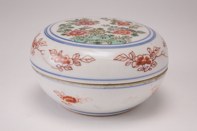 Round box on footring, domed cover. The inside is glazed. Famille verte, decorated in green, yellow, aubergine, iron-red and black enamel on the glaze. On the cover flowering plants near a fence within an underglaze-blue three-fold circle. On the sides of the cover linked flower sprays. (Engels)