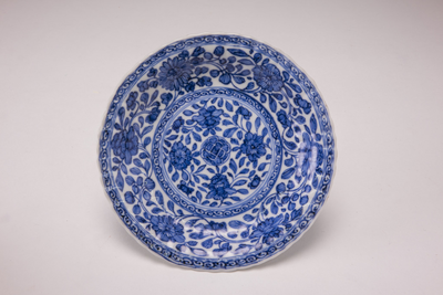 Klein gelobd schoteltje met gegolfde rand. Op het plat drukbewerkt blauw bloemdecor. (Nederlands)