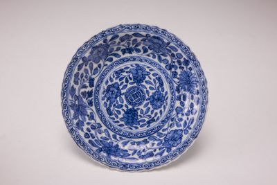 Klein gelobd schoteltje met gegolfde rand. Op het plat drukbewerkt blauw bloemdecor.