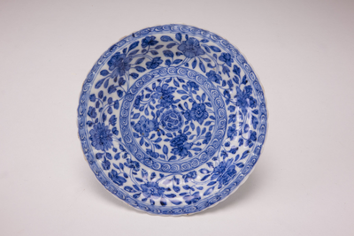 Klein gelobd schoteltje met gegolfde rand. Op het plat drukbewerkt blauw bloemdecor. (Nederlands)