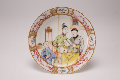 Mandarijnschoteltje met op het plat een man en een vrouw met twee kinderen, Van Diepencollectie, JMD-P-1343 |