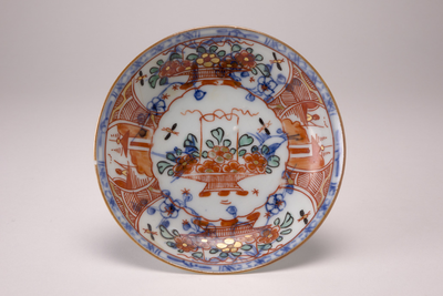 Amsterdams bont schotel met gekartelde rand en op het plat, over de blauwe voorstelling, een hengselmand. Langs de binnenrand een blauwe band en vier uitsparingen met hierin een hengselmand en in de twee anderen een landschapje. (Nederlands)
