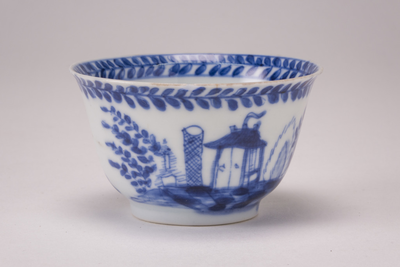 Wit kommetje met donkerblauwe zogeheten; "Koekoek uit het huisje" decoratie met o.a. bladertakken, bloemen, twee vogels en een huisje. (Nederlands)