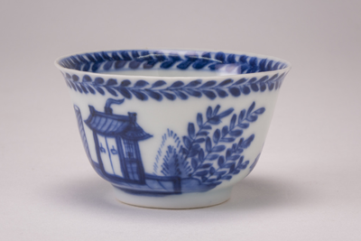 Wit kommetje met donkerblauwe zogeheten; "Koekoek uit het huisje" decoratie met o.a. bladertakken, bloemen, twee vogels en een huisje. (Nederlands)