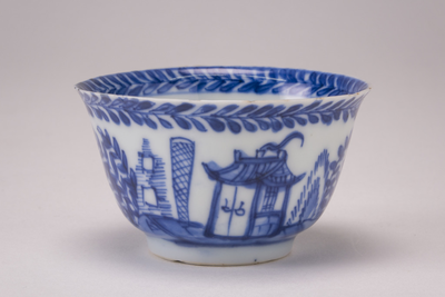 Wit kommetje met donkerblauwe zogeheten; "Koekoek uit het huisje" decoratie met o.a. bladertakken, bloemen, twee vogels en een huisje.