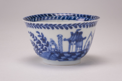 Wit kommetje met donkerblauwe zogeheten; "Koekoek uit het huisje" decoratie met o.a. bladertakken, bloemen, twee vogels en een huisje.