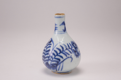 Wit peervormig miniatuurvaasje met blauwe bloemdecoraties.