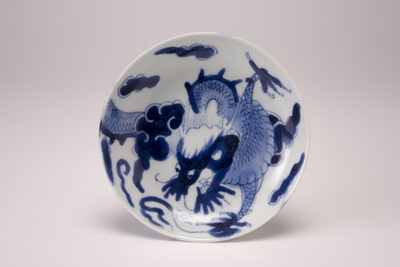 Wit schoteltje met op de binnen en buitenzijde een blauwe draak en kleine wolkjes, Van Diepencollectie, JMD-P-1375 |