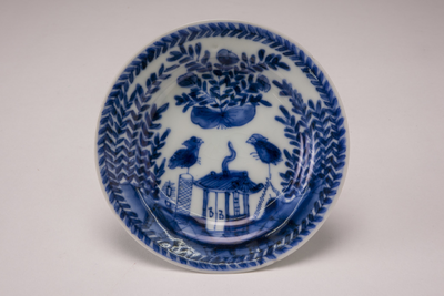 Wit schoteltje met donkerblauwe zogeheten; "Koekoek uit het huisje" decoratie met o.a. bladertakken, bloemen, twee vogels en een huisje. (Nederlands)