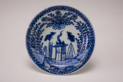 Wit schoteltje met donkerblauwe zogeheten; "Koekoek uit het huisje" decoratie met o.a. bladertakken, bloemen, twee vogels en een huisje. (Nederlands)