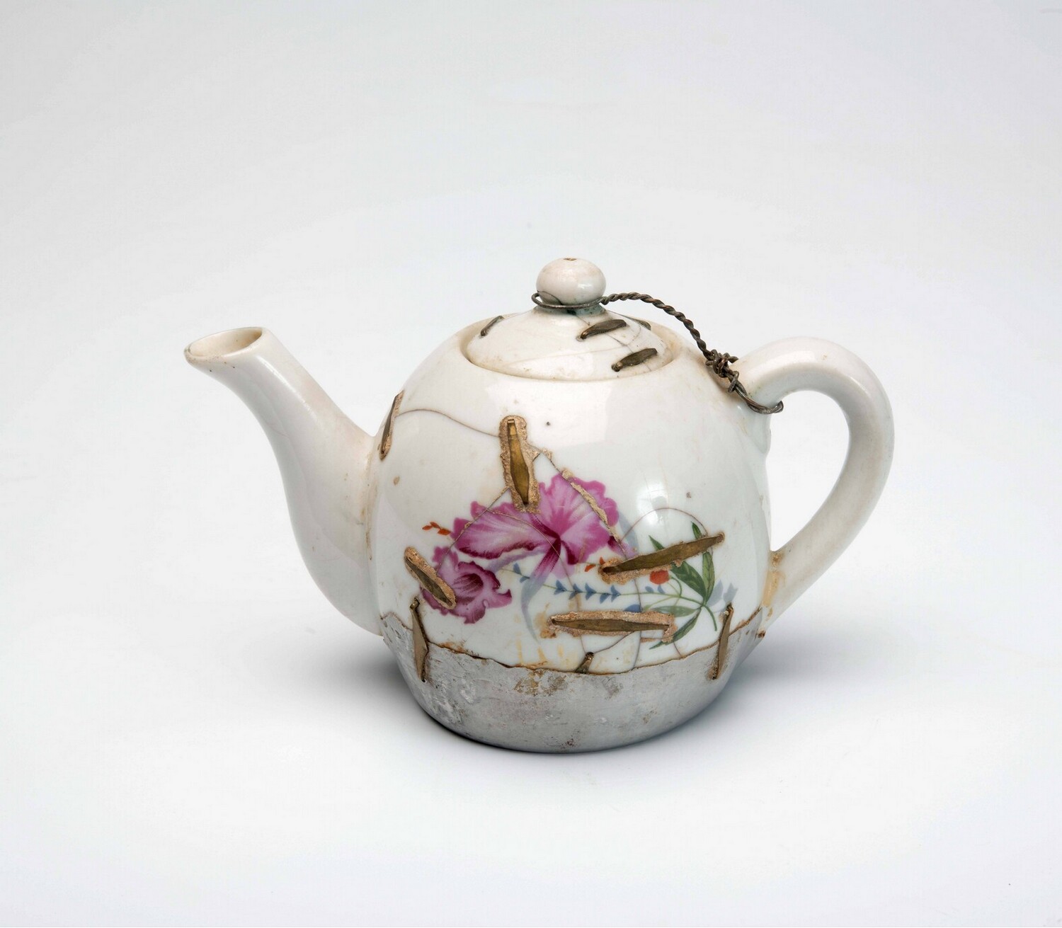 Porseleinen theepot gerepareerd met krammen (Q42473)