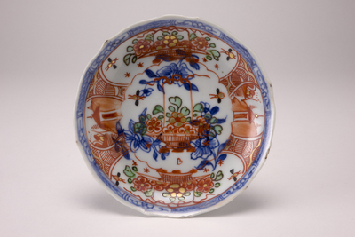 Amsterdams bont schotel met gegolfde rand en op het plat een hengselmand. Langs de binnenrand een blauwe band en vier uitsparingen met hierin een hengselmand en in de twee anderen een landschapje. (Nederlands)