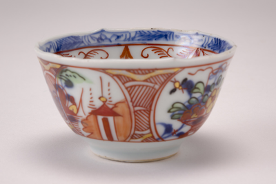 Amsterdams bont kommetje op standring. Op de bodem een hengselmand. Langs de binnenrand een blauwe band. Aan de buitenzijde vier uitsparingen met hierin een hengselmand en in de twee anderen een landschapje. (Nederlands)