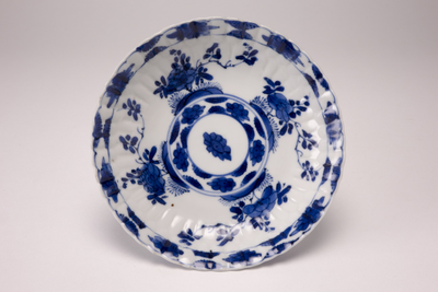 Witte gelobde schotel met gegolfde bovenrand. Op het plat een blauw bloemen- en rankendecor. (Nederlands)