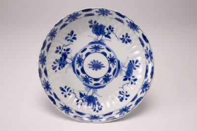 Witte gelobde schotel met gegolfde bovenrand. Op het plat een blauw bloemen- en rankendecor. (Nederlands)
