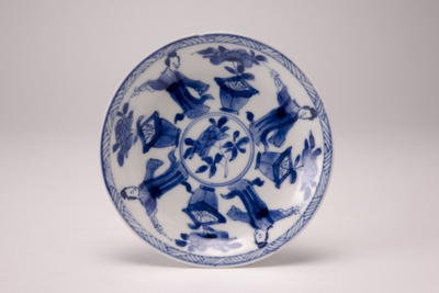 Wit schoteltje met op het plat vier blauwe lijzen en vier bloemenbakjes rond een cirkel met een bloem.