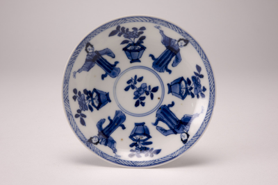 Wit schoteltje met op het plat vier blauwe lijzen en vier bloemenbakjes rond een cirkel met een bloem, Van Diepencollectie, JMD-P-1422 |