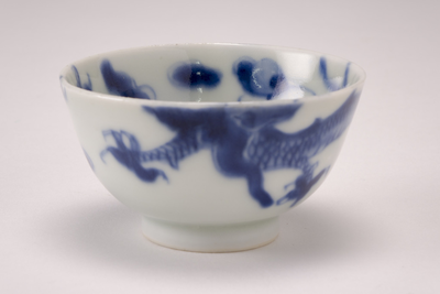 Wit kommetje met op de binnen en buitenzijde een blauwe draak en kleine wolkjes.