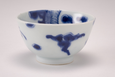 Wit kommetje met op de binnen en buitenzijde een blauwe draak en kleine wolkjes.