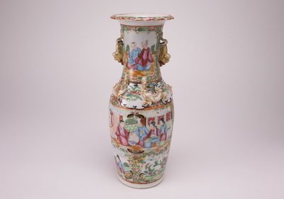 Hoge vaas (Kutani-fles?)met smalle tuitvormige hals. Op de schouders in reliëf vier draken. Op de gehele buitenzijde famille rose decors met hierin o.a. zittende personen.