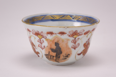 Imari kommetje met langs de binnenrand een blauw met goud gearceerde band. Op de buitenzijde een ijzerrood, goud en zwart "melk en bloed" motief met tulpvormige kaders waarin chinese personen zijn afgebeeld. (Nederlands)