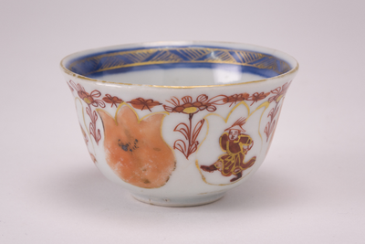 Imari kommetje met langs de binnenrand een blauw met goud gearceerde band. Op de buitenzijde een ijzerrood, goud en zwart "melk en bloed" motief met tulpvormige kaders waarin chinese personen zijn afgebeeld. (Nederlands)