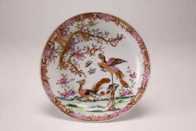 Schoteltje op voetring, spreidende wand. In China onversierd, gedecoreerd in emailkleuren met een tuinlandschap. Rechts een fazant met opgetrokken poot staand op een rotsblok, daarnaast een zittende fazant. Links een bloeiende boom, de stam aan de zijkant voortkomend uit de bloemenrand langs de kant. Eenzelfde bloemenrand langs de binnenkant van de koppen. Binnenin op de bodem van de koppen een bloempje. (Nederlands)