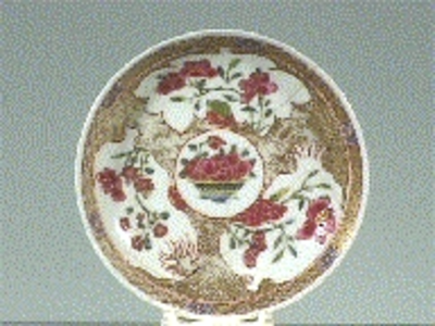 Klein schoteltje met famille rose bloemdecoraties met hieromheen een goudkleurig decor, Van Diepencollectie, JMD-P-1474 |