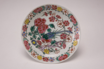 Famille rose schoteltje met meerkleurige bloementakken en een fazant. Yung-cheng. (Nederlands)