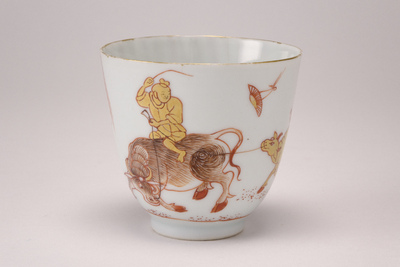Witte hoge kop met op de buitenzijde een decoratie in goud en rood (melk en bloed) van twee buffels met een jongetje en een boom.