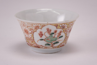Famille rose kommetje met in vier uitsparingen meerkleurige decors. Hieromheen opgevuld met witte bloempjes op een goudkleurige ondergrond.