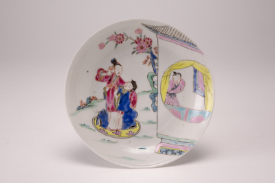 Famille rose schoteltje met op het plat drie personen en een hoek van een huis met een rond raam.
