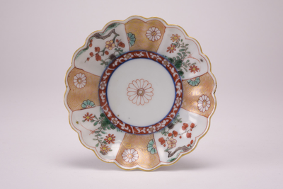 Famille verte schoteltje met gelobde golvende rand. Op het plat goudkleurige- en witte vlakken met bloemen rond een cirkel. (Nederlands)