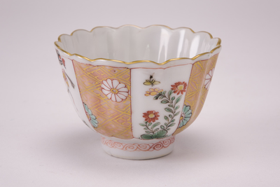 Famille verte kopje met gelobde golvende rand. Op de buitenzijde goudkleurige- en witte vlakken met bloemen. (Nederlands)
