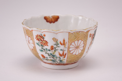 Famille verte kopje met gelobde golvende rand. Op de buitenzijde goudkleurige- en witte vlakken met bloemen. (Nederlands)