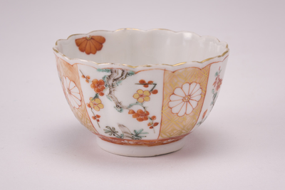 Famille verte kopje met gelobde golvende rand. Op de buitenzijde goudkleurige- en witte vlakken met bloemen. (Nederlands)