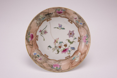 Roze gemarmerde schotel met op het plat een witte uitsparing met hierin een meerkleurig bloemdecor.
