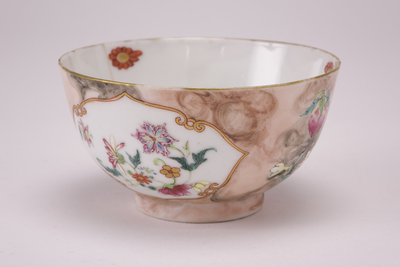 Roze gemarmerd kommetje met twee witte uitsparingen met hierin een meerkleurig bloemdecor. Op de marmering enkele perzikken. Langs de binnerand enkele bloemen.